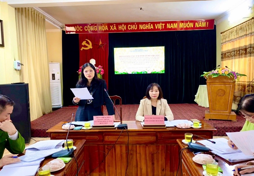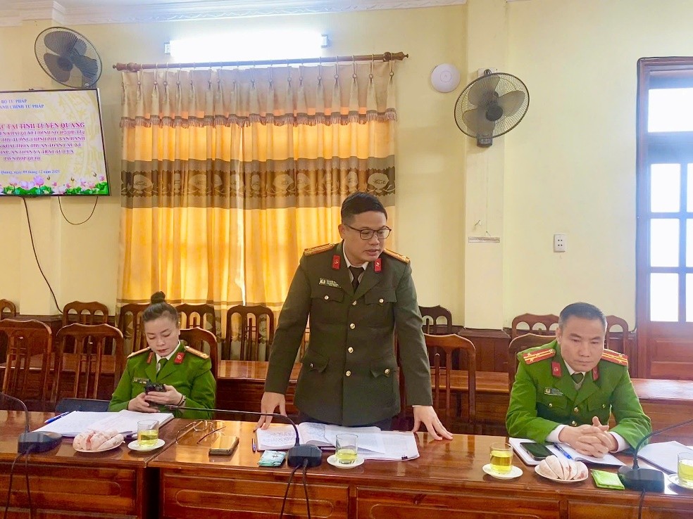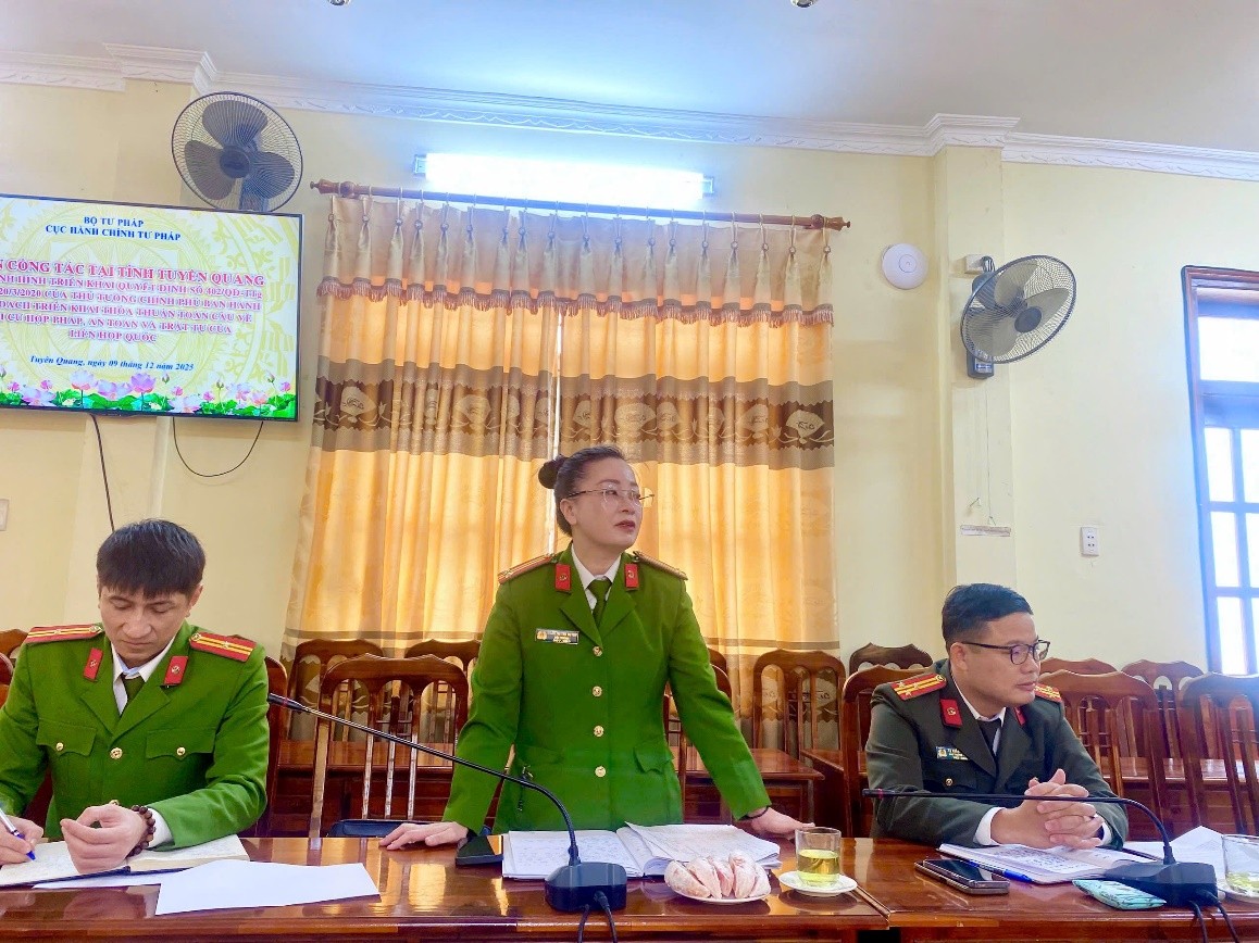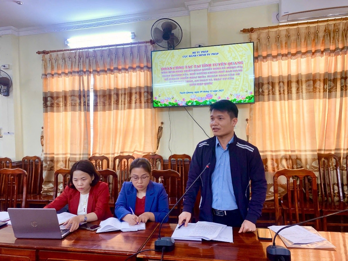 Chủ trì buổi làm việc có bà Trần Thị Lệ Hoa, Phó Cục trưởng Cục Hành chính tư pháp, Bộ Tư pháp và bà Đặng Thị Thanh Hương, Phó Giám đốc Sở Tư pháp tỉnh Tuyên Quang; tham dự buổi làm việc có đại diện Lãnh đạo, cán bộ, chuyên viên một số phòng, đơn vị có liên quan thuộc Cục Hành chính tư pháp, Sở Tư pháp, Công an tỉnh, UBND cấp xã.