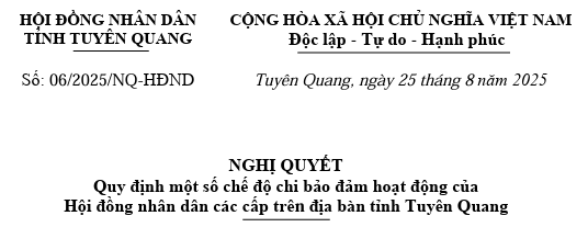 Ngày 25/8/2025, Hội đồng nhân dân tỉnh Tuyên Quang đã ban hành ban hành Nghị quyết số 06/2025/NQ-HĐND quy định một số chế độ chi bảo đảm hoạt động của Hội đồng nhân dân các cấp trên địa bàn tỉnh Tuyên Quang, có hiệu lực thi hành kể từ ngày 25/8/2025.