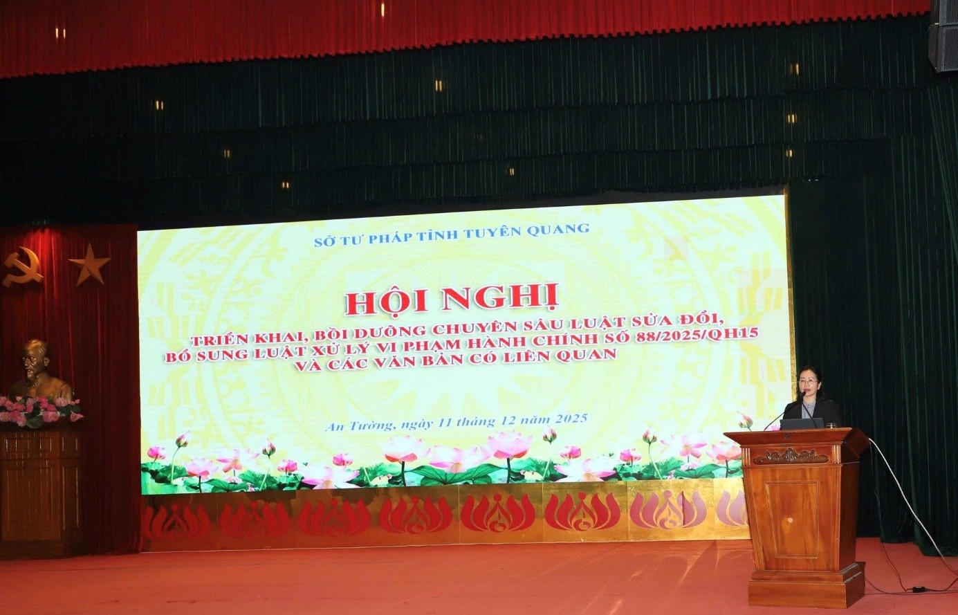 Ngày 11 và 12/12/2025, Sở Tư pháp tỉnh Tuyên Quang đã tổ chức Hội nghị triển khai, bồi dưỡng chuyên sâu Luật sửa đổi, bổ sung Luật Xử lý vi phạm hành chính số 88/2025/QH15 và các văn bản có liên quan năm 2025. Đồng chí Vũ Thị Như Trang, Phó Giám đốc Sở Tư pháp dự và chỉ đạo Hội nghị.