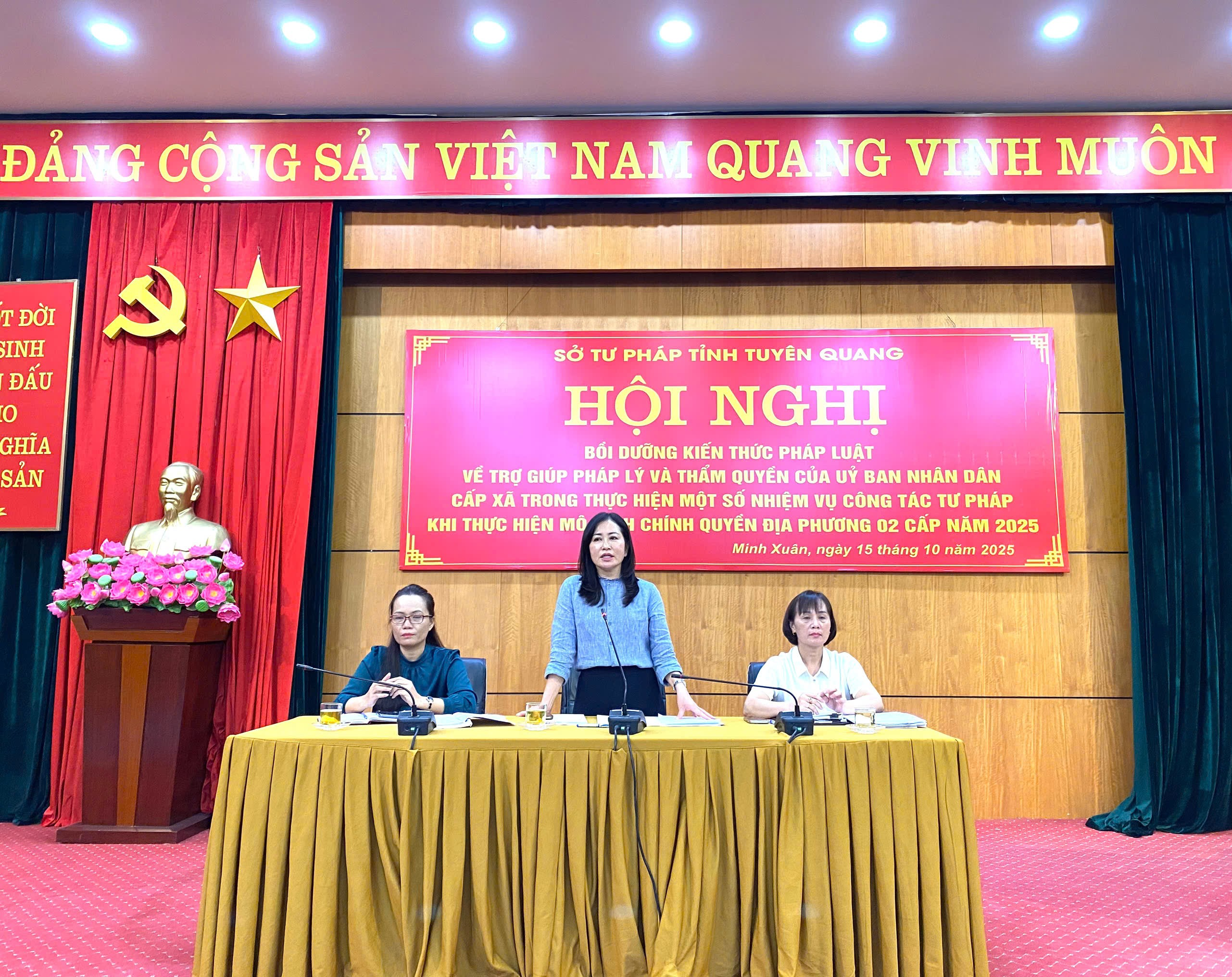 Ngày 15/10/2025, Sở Tư pháp tỉnh Tuyên Quang đã tổ chức Hội nghị bồi dưỡng kiến thức pháp luật về trợ giúp pháp lý và thẩm quyền của Uỷ ban nhân dân cấp xã trong thực hiện một số nhiệm vụ công tác tư pháp khi thực hiện mô hình chính quyền địa phương 02 cấp. Đồng chí Vũ Thị Như Trang, Phó Giám đốc Sở Tư pháp chủ trì Hội nghị.